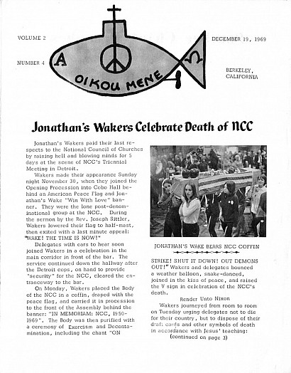 Members of these alternative churches are mostly young people involved in the counterculture movement. The Free Church in Berkeley, California is the most popular, with a 24-hour hotline and an active newsletter. The song and movie embody the values these churches hold dear: unity, peace, liberation. It's where you can "love each other in a groovy way," one of their reverends explains. These churches are all over the country, with names like Ecstatic Umbrella and Alice's Restaurant. Many are offshoots of Protestant or Catholic denominations. After a few years, these submarine churches all go under. (photo courtesy Graduate Theological Union)