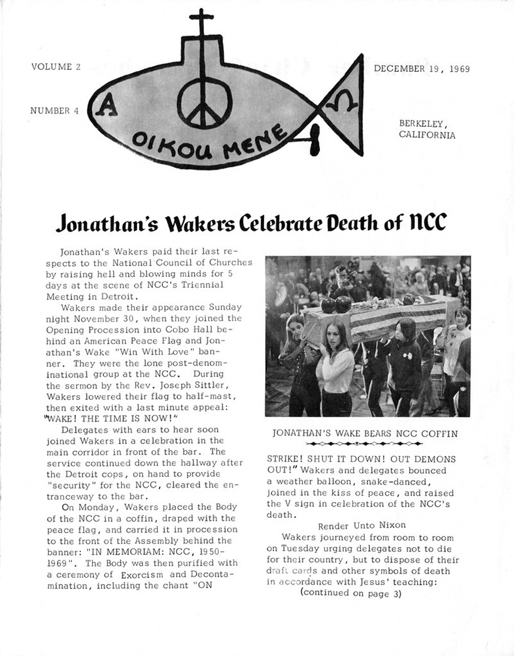 1970The New York Times reports on "submarine churches" inspired by the Beatles' "Yellow Submarine." Their logos are variations of a submarine with the periscope forming a peace sign.