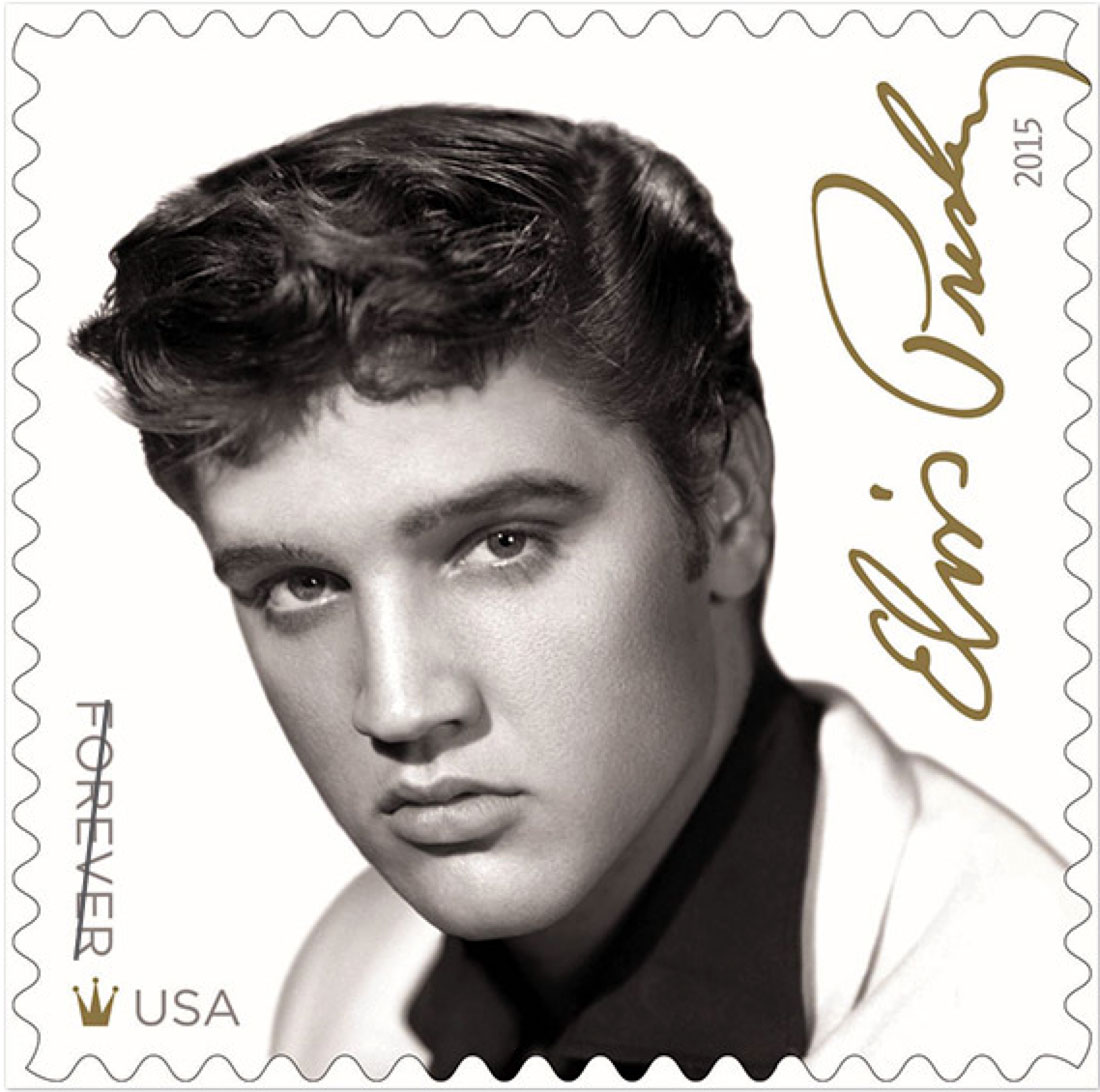 2015Elvis Presley is granted the honor of a second postage stamp bearing his likeness (the first was introduced in 1993). This one features a black-and-white photograph by William Speer of Elvis in 1955 and is part of the Music Icon series that began in 2013.