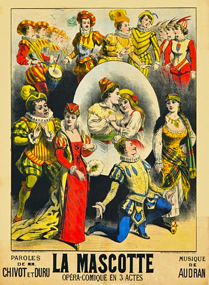 La Mascotte is written by Edmond Audran (1840-1901), a church organist in the French city of Marseilles who also writes comic operas. In 1880 he penned a popular comic operetta with a central figure, Bettina, a country girl who looked after her master's turkeys. Her extraordinary good fortune could not be due to mere chance, but must have been caused by some supernatural agent. Looking for an appropriate figure and name for the opera, Audran picked the Provencal slang term "La Mascotte," used by gamblers to mean talisman or charm. When the opera becomes so popular that it is translated into English as The Mascot, introducing into the English language a word for any animal, person, or object that brings good luck.