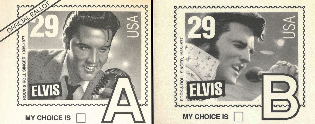 1992Balloting begins to decide the design on the new Elvis stamp. The choice is between a fit '50s Elvis or a more plump '70s one. Young Elvis wins in a landslide.