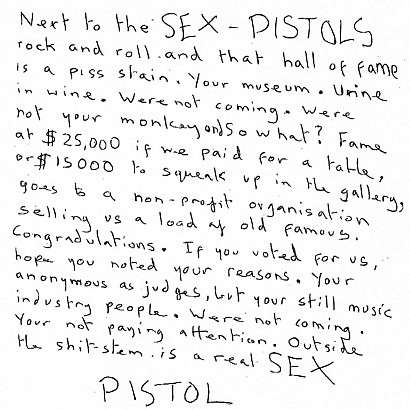 Sabbath, eligible for 10 years and nominated eight times, had grown frustrated with the Hall, which seemingly had no space for the band that pretty much invented heavy metal. In 1999, Ozzy Osborne wrote an open letter to the organization: "Just take our name off the list. Save the ink. Forget about us. The nomination is meaningless, because it's not voted on by the fans. It's voted on by the supposed elite for the industry and the media, who've never bought an album or concert ticket in their lives, so their vote is irrelevant to me." Despite this, Ozzy does attend the ceremony and accepts the induction, later apologizing about the letter. Holding more of a grudge are the Sex Pistols, who do not attend the ceremony. Instead, Johnny Rotten writes a letter on their website: "Next to the Sex Pistols, rock and roll and that hall of fame is a piss stain. We're not your monkeys, we're not coming. You're not paying attention." At the ceremony, Jann Wenner of Rolling Stone reads it when he inducts the band. At the festivities, Metallica salutes Sabbath by performing "Hole in the Sky" and "Iron Man"; Skynryd, inducted by Kid Rock, close the ceremony in the most predictable way possible: with a jam of "Free Bird." The most controversial incident of the evening comes with Blondie's induction, which gets rather awkward when former members Frank Infante and Nigel Harrison take to the podium and literally beg Debbie Harry to let them play with the band. She refuses, telling Infante, "Can't you see my band is up there?" (photo from the Sex Pistols' official announcement)