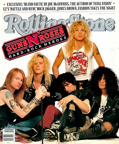 1988Guns N' Roses get the cover of Rolling Stone with the headline, "Hard-Rock Heroes." The magazine compiled the story that summer when the band was on tour as the opening act for Aerosmith. Aerosmith assumed they were getting the cover, but by the end of the tour, their opening act had become much more popular.