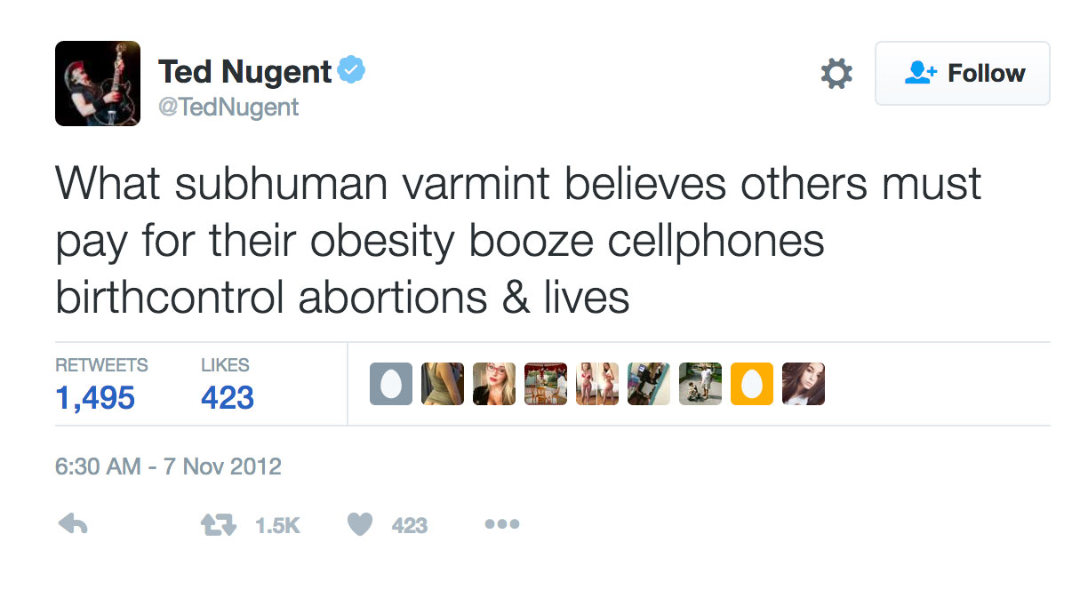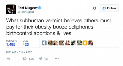2012US President Barack Obama wins the election to serve a second term. The news is greeted enthusiastically by Lady Gaga, Snoop Dogg, Cher, and many others. However, notoriously conservative Ted Nugent rains on the parade, posting scathing comments on Twitter. Nugent unleashes a volley of insults against Obama supporters, calling them "pimps," "whores," welfare brats," "subhuman varmints," and even more derogatory terms.