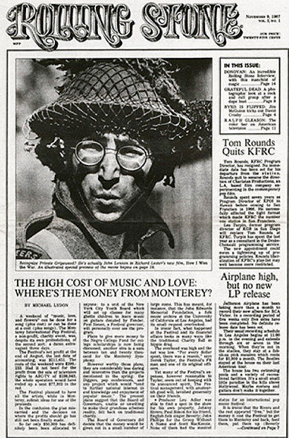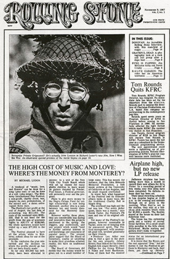 In its early years of publication, Rolling Stone is known primarily for its reporting on music and related issues, especially politics. In the debut issue, founder Jann Wenner writes in the Editor's Note that Rolling Stone is intended to be a combination of a newspaper and a magazine. Indeed, the first three editions resemble a newspaper more than the glossy magazine it eventually becomes. The magazine's name is at least partly inspired by the Bob Dylan hit "Like a Rolling Stone" - earlier in the year, co-founder Ralph Gleason published an essay titled "Like A Rolling Stone" in The American Scholar. Jann Wenner cites other influences in the introduction, explaining: "Muddy Waters used the name for a song he wrote. The Rolling Stones took their name from Muddy's song. 'Like a Rolling Stone' was the title of Bob Dylan's first rock and roll record." John Lennon is the first cover subject. The still shot from the movie set of How I Won the War shows the Beatle in his familiar round glasses and a mesh-covered helmet, setting the tone for the mix of music and politics that become the magazine's hallmark. The first issue costs 35 cents and becomes a collector's item, selling for upwards of $400 decades later. Among the stories in this first issue are an investigative report on how the proceeds from the Monterey Pop Festival were spent, as well as reviews of Arlo Guthrie's Alice's Restaurant and Traffic's Hole in My Shoe. The magazine becomes so popular that by 1972 making the cover is seen as the pinnacle of success, which Dr. Hook & the Medicine Show explain in their 1972 hit The Cover of "Rolling Stone": We take all kinds of pills To give us all kind of thrills But the thrill we've never known Is the thrill that'll getcha When you get your picture On the cover of the Rolling Stone When the editors realize they are aging out of their demographic, they bring in young writers to keep it fresh. One of these is the journalism prodigy Cameron Crowe, who begins writing for the magazine in 1973 at age 16, covering the likes of Deep Purple, The Allman Brothers and Jackson Browne. These experiences form the basis for his 2000 film Almost Famous.