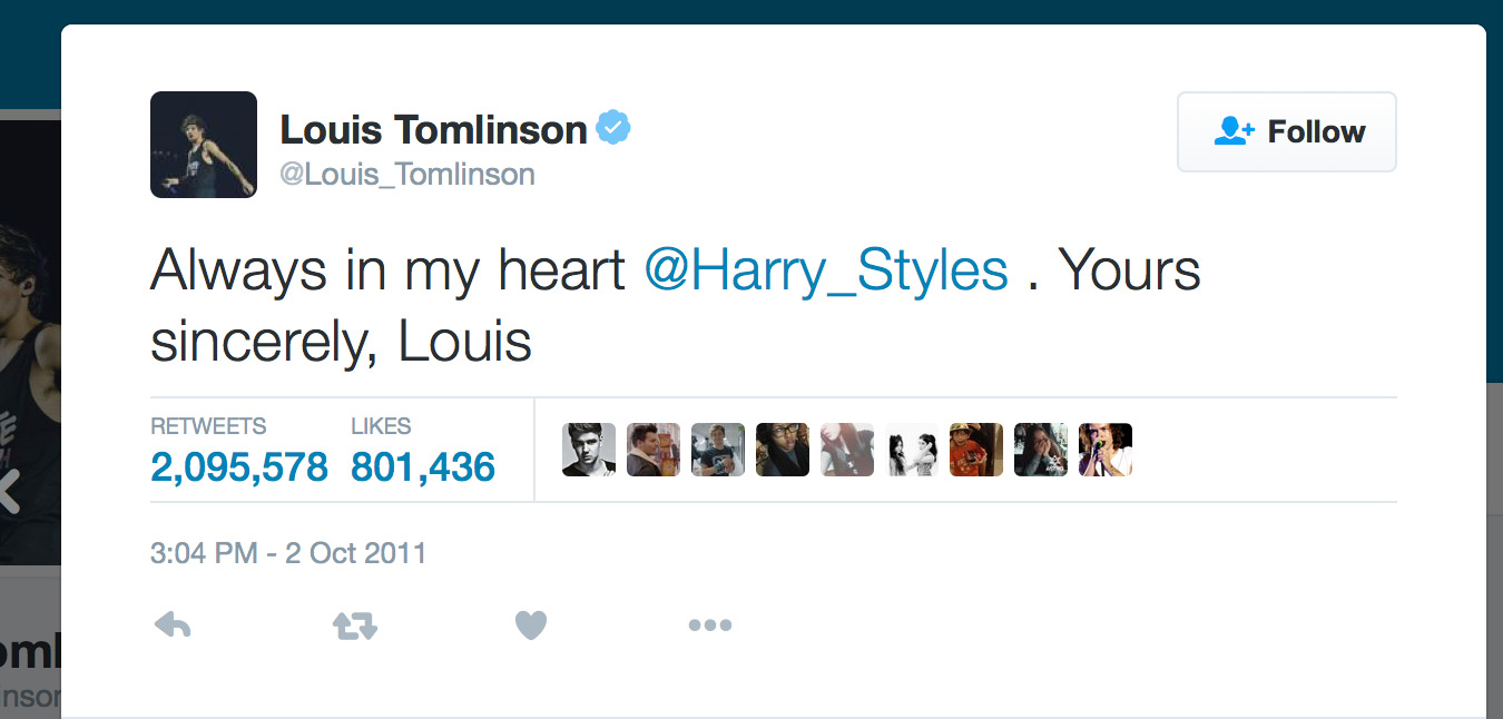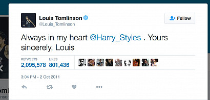 After Styles says in a video interview, "My first real crush was Louis Tomlinson," Tomlinson sends this tweet: "Always in my heart @Harry_Styles. Yours sincerely, Louis." 1D fans become aflutter with the thought of Harry and Louis in love, and retweet it like crazy. The tweet becomes kind of a historical archive, a remnant from the early days of Twitter and an innocent time when the guys actually tweeted each other. The retweets keep coming, and in 2015 it passes Barack Obama's "Four more years" tweet to take second place behind the Ellen DeGeneres Oscar selfie.